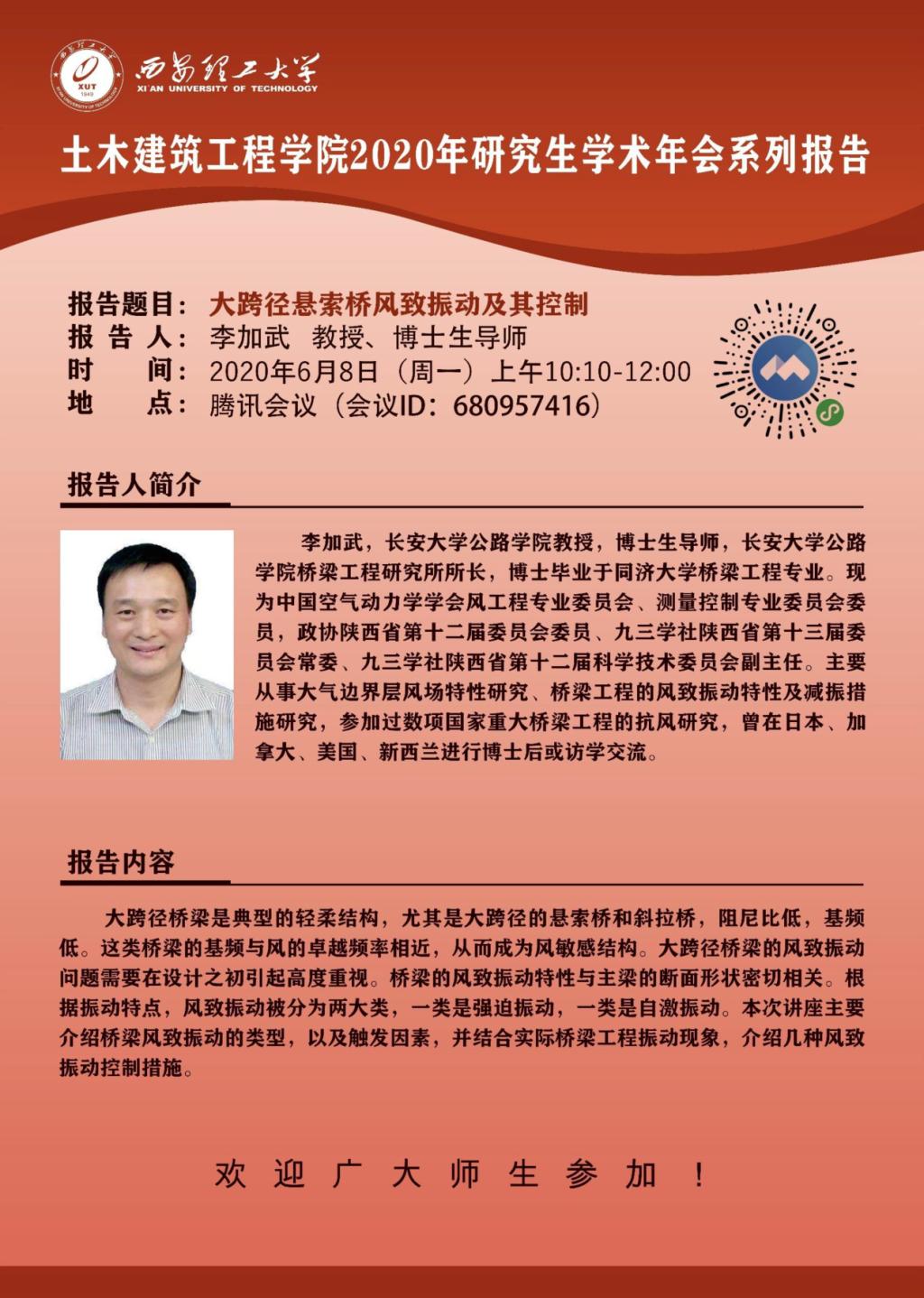 报告人简介:李加武,长安大学公路学院教授,博士生导师,长安大学公路学院桥梁工程研究所所长,博士毕业于同济大学桥梁工程专业。现为中国空气动力学学会风工程专业委员会、测量控制专业委员会委员,政协陕西省第十二届委员会委员、九三学社陕西省第十三届委员会常委、九三学社陕西省第十二届科学技术委员会副主任。主要从事大气边界层风场特性研究、桥梁工程的风致振动特性及减振措施研究,参加过数项国家重大桥梁工程的抗风研究,曾在日本、加拿大、美国、新西兰进行博士后或访学交流。