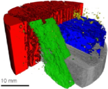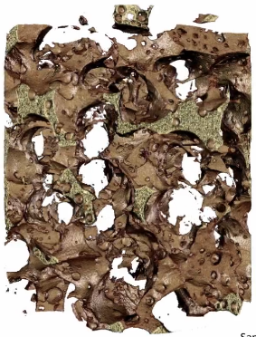 无损3D成像对于增材制造的发展至关重要。 粉末冶金不锈钢样品经过激光烧结,并使用XRM成像。基于3D数据体,将未烧结的固相进行图像分割并对其体积进行定量测量。在不损坏样品情况下,X射线显微镜还可通过虚拟切片的查看确定感兴趣区域,进而进行内部断层扫描成像的能力。