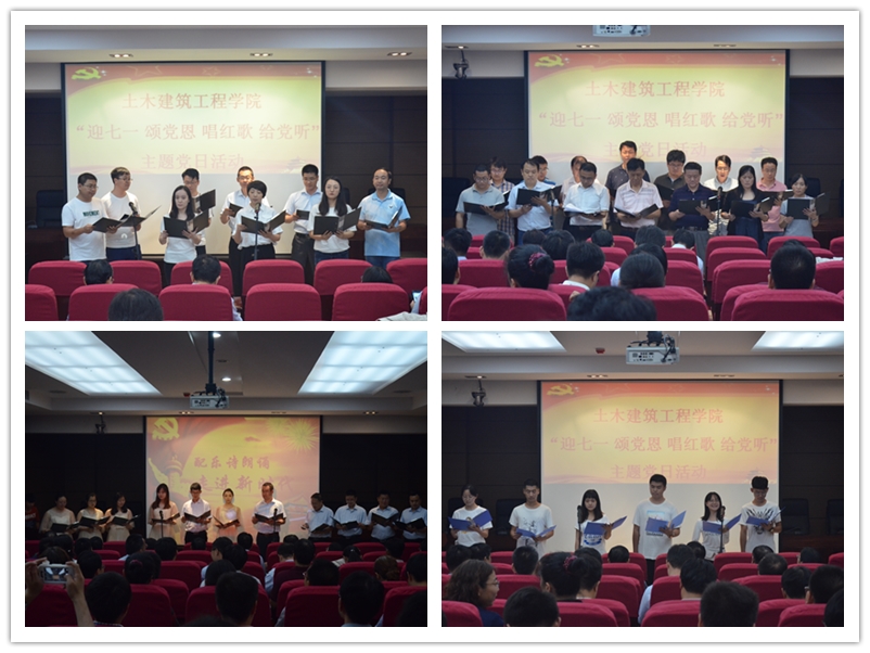 永利集团88304土木系党支部,工管系党支部,力学系党支部,建规系党支部,岩土所党支部和院行政党支部分别进行了题为“我的祖国”、“回延安”、“祖国颂”、“沁园春·雪”、“党旗飘飘”、“走进新时代”的配乐主题朗诵。教工党员们在朗诵过程中,慷慨激昂,饱满热情,精神抖擞,抑扬顿挫,用自己真挚的感情来抒发着对党和国家的热爱,现场浓厚的党支部活动氛围激发着每一位党员的自豪感与荣誉感。比赛最后,由学院团委选派的学生进行了题为“党在我心中”的朗诵表演。