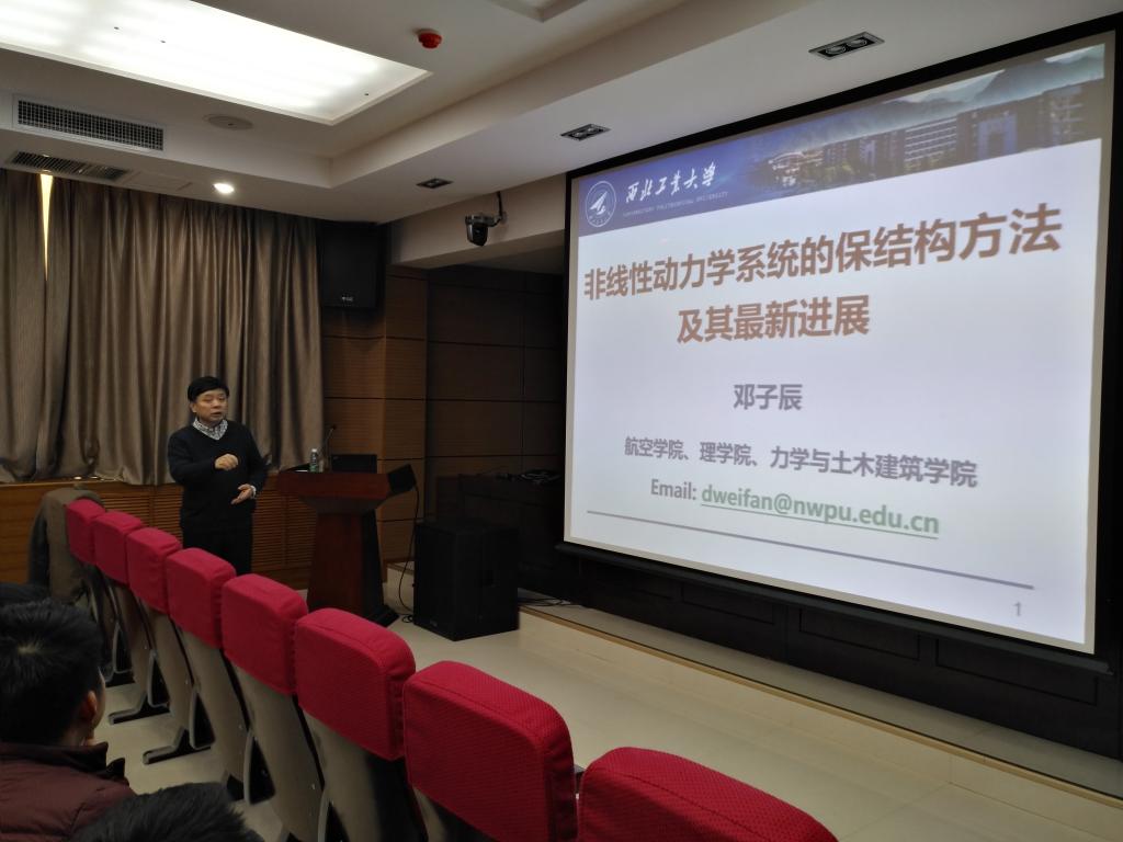 2018年11月28日下午,应永利集团88304邀请,长江学者、西北工业大学教授邓子辰在我校金花校区1号学科楼学术报告厅为我校师生作了题为“非线性动力学系统的保结构方法及其应用”的学术报告。我校力学、土木和机械专业的教师和学生参加了本次报告会。