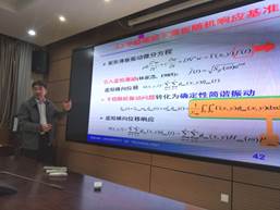 报告会上,杨迪雄教授首先介绍了板壳结构在随机激励下相关参数的不确定性,详细讲解了线性随机振动和非线性随机振动分析的研究方法,阐述了虚拟激励法在线性随机振动分析中的高效性。最后,讲解了弹性板壳连续体结构在平稳激励和非平稳激励下的精确解。