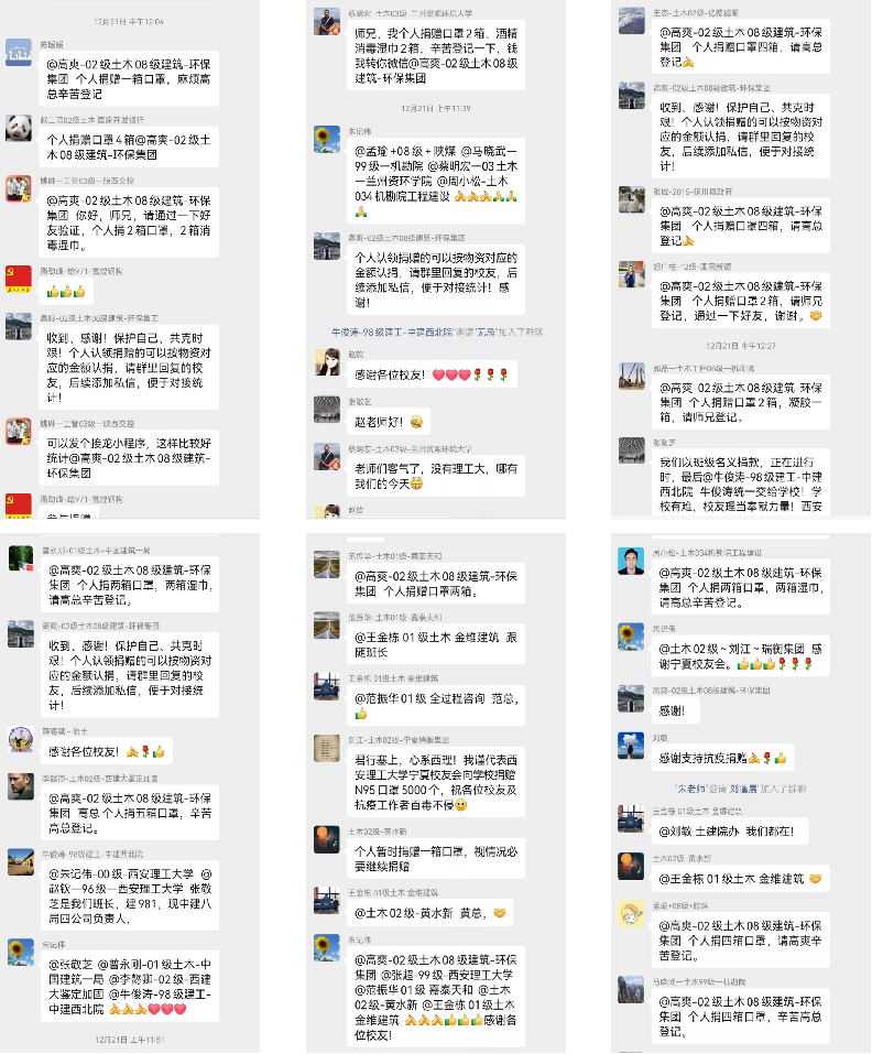 中建四局西北公司西安分公司、西安华筑建筑设计有限公司、永利集团宁夏校友会、建981班(张敬芝、邓国华、刘斌、牛俊涛、张卫东、阙良刚、郭瑞、刘群利、王博)、土木02级建筑与土木08级(研)高爽、土木03级周小松、土木02级黄水新、土木01级王金栋、土木08级孟瑜、土木01级曹铖、土木02级李懿卿、土木99级马晓武、土木01级普永刚、土木06级郭磊、建筑与土木工程15级(研)张域、工管12级(研)胡广柱、工管03级姚琳、土木07级袁国浩、土木02级胡峰山、土木03级蔡明宏、土木01级范振华、工管12级陈媛媛、土木02级刘江、土木02级赵二项、土木02级王杰、土木10级李征、土木14级惠康、工管12级黄欢、工管08级张丹、水工99级05工管(研)任少辉、水工90级结构18级(研)孙浩康、土木99级张涛、工管07级佀小伟、给99级张超、土木05级王鑫、土木03级毛浪、水工99级薛源、工管05级郝松、土木99级杨碧峰、土木13级杨帅、工管11级蒋雅丽、土木96级王晓荣、水工02级曲星、工管05级袁丹、包941刘勇、机176唐冬平、土木04级张军、土木05级刘世鑫