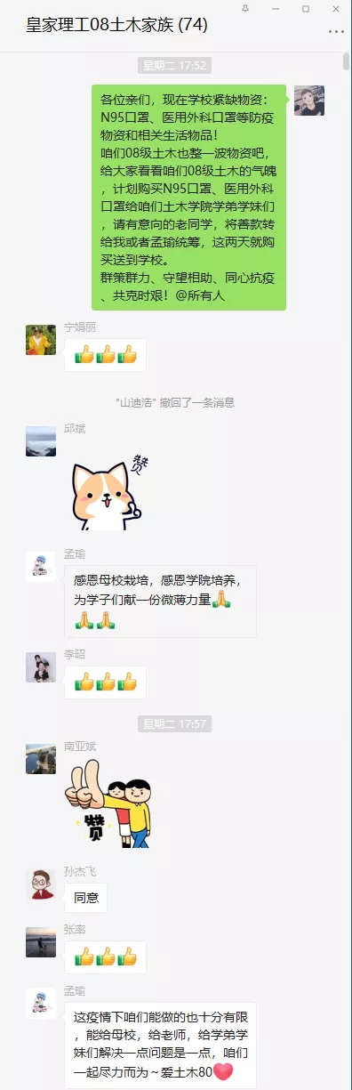 “我在学院校友群看到校友及合作单位向学校捐赠防疫物资的推文,心想着我们08级土木校友能否也组织一波捐赠,便将学校紧缺医护物资的消息转发到咱们08级土木专业学生群,大家一呼百应,焦心焦急,纷纷表示要伸出援手,助力母校。”08级土木工程专业校友董静说到。