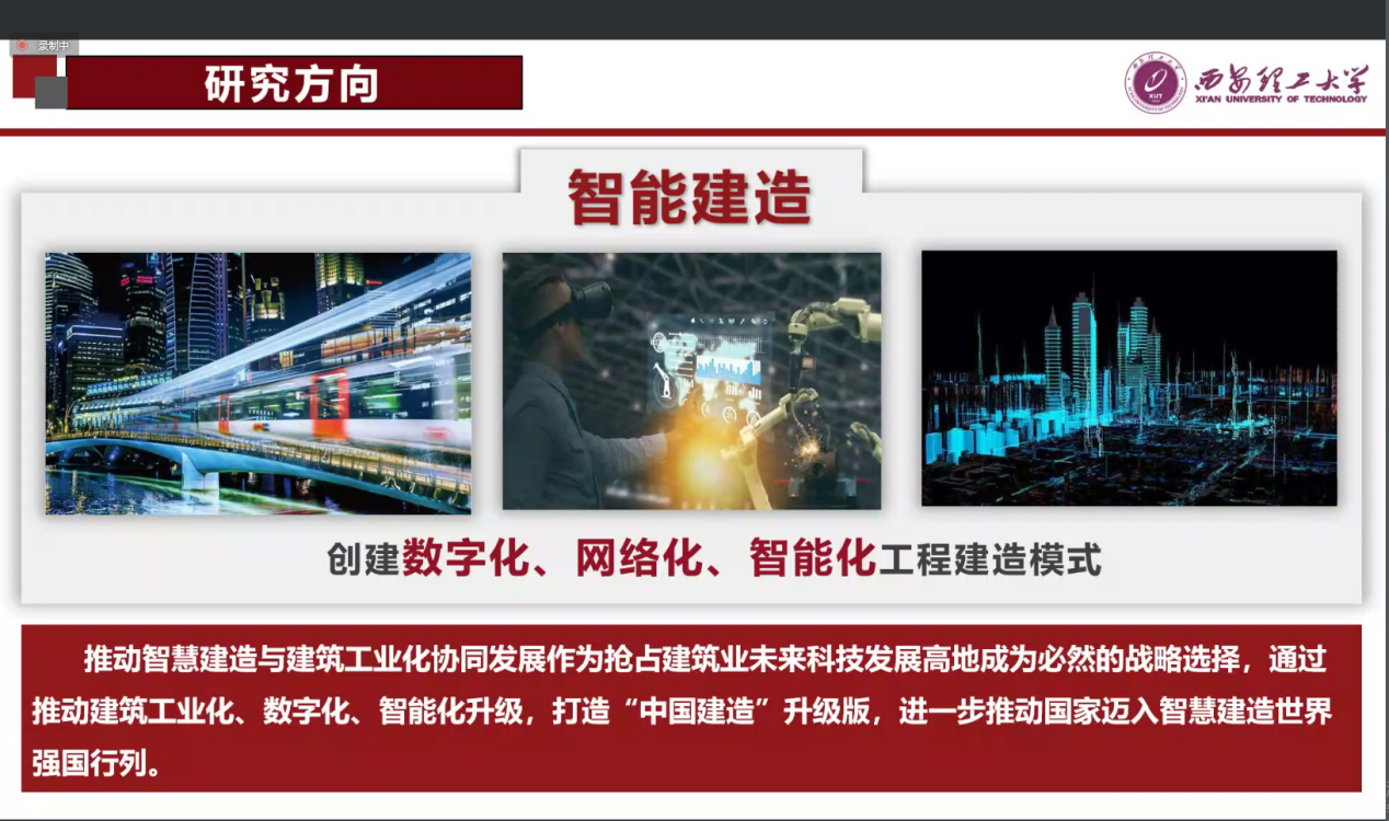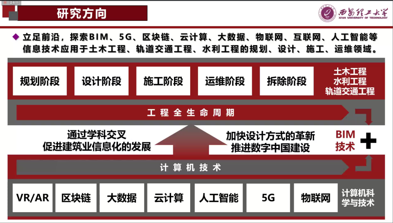随后,赵钦介绍了团队的科学研究以及双创成果,并针对关于创新创业的感受与大家进行了分享。其团队主要是围绕智能建造这个方向,依托多学科的交叉,应用BIM+技术,计算机虚拟现实VR、AR、人工智能,大数据等技术在土木工程、轨道交通工程建设中的信息化、智能化研究,来解决部分工程中的问题。