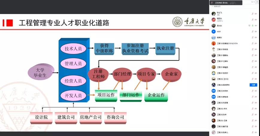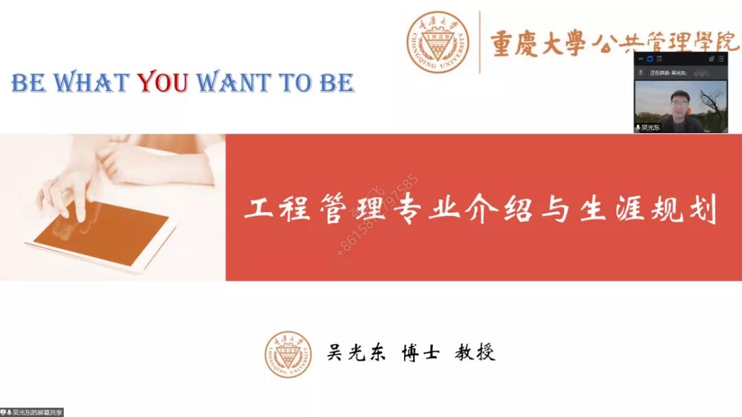在全校师生同心抗疫、共克时艰的非常时期,1月12日上午,永利集团88304工程管理专业2006届优秀校友、重庆大学公共管理学院博士生导师、重庆市本科一流专业(城市管理)负责人吴光东教授,应邀线上为我校工程管理专业本科生和研究生作了题为“工程管理专业介绍与生涯规划”专题报告。工程管理系教工支部书记程圣东主持报告会。