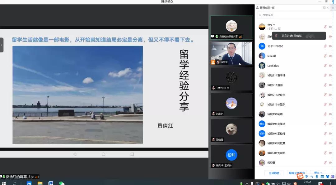 最后,徐冬平副教授对讲座进行了总结,讲座内容丰富精彩。通过与在校同学们在留学择校、留学准备、留学生活、心得体会等方面开展交流,不但对有意向出国深造的同学提供了帮助,而且鼓励了同学们认真学习专业知识,拓展自己的知识面,增加知识储备量。讲座不仅丰富了同学们在疫情封闭期间的学习生活,也让同学们通过了解师兄师姐们丰富的留学经历激励自我,坚定踔厉奋发、笃行不怠的决心!