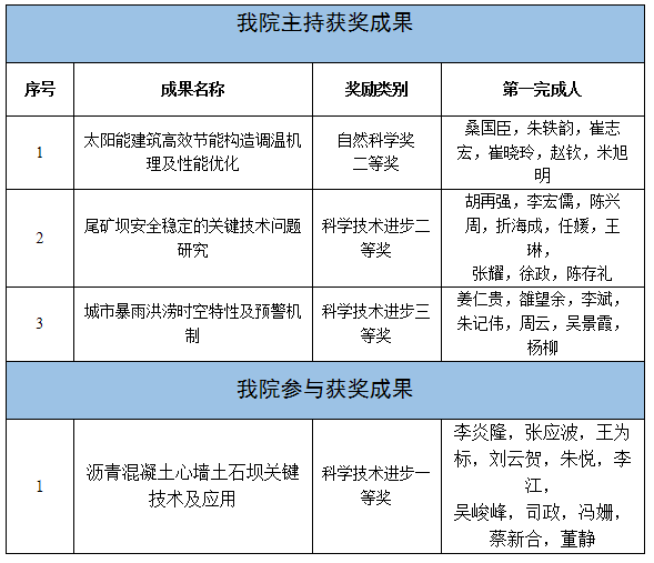 桑国臣教授主持完成成果获自然科学奖二等奖,胡再强教授和姜仁贵教授主持完成成果分别获得科学技术进步二等奖、三等奖;张应波高工作为第二完成人参与完成成果获科学技术进步一等奖。