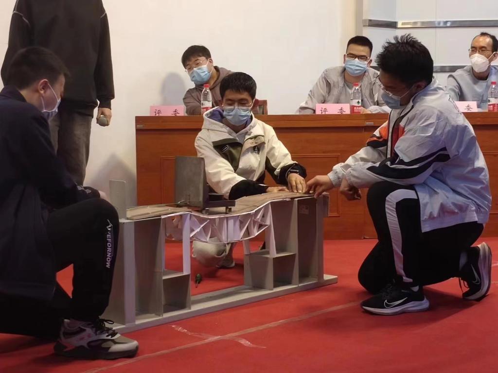 本次竞赛的赛题为“桥梁结构模型设计与制作”。赛题以承受竖向移动荷载的桥梁结构为对象,要求参赛选手在规定时间内制作一座完全由白卡纸制作的桥梁模型。赛题以新工科建设为引领,聚焦人才培养,突出多学科交叉协同与创新创造,从提升学生工程实践和创新能力角度出发,激发学生学习兴趣和工程创新潜能。本次竞赛共吸引来自机械与精密仪器工程学院、自动化与信息工程学院、水利水电学院、国际工学院、永利集团88304等5个学院的50余支队伍报名参赛。受疫情影响,本次竞赛调整至本学期初开展。在经过前期培训、自主设计、模型制作等多个环节后,各参赛队现场向评委展示模型和制作思路并回答评委提问,同时将桥梁模型放置于加载装置上进行现场加载。评委综合桥梁模型制作、设计方案答辩和各级加载情况等方面进行评分,最终评选出了一、二、三等奖。