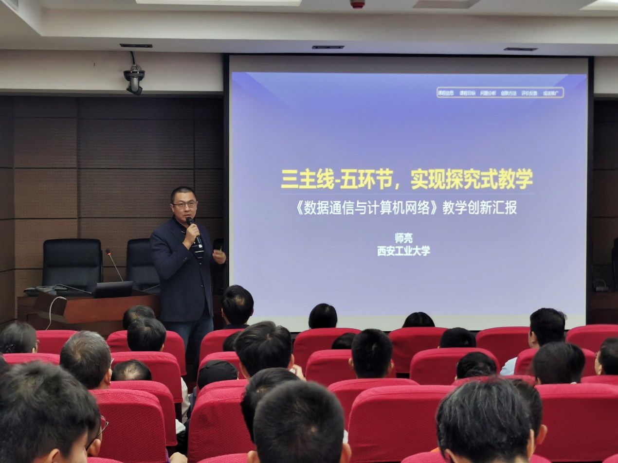 师亮以“三主线-五环节,实现探究式教学”为主题进行示范教学,他从教学设计的内在逻辑开始,以DNS查询服务为例,从课程信息、课程目标、问题分析、创新方法、评价反馈和成效推广等方面详细阐述了整个教学设计。