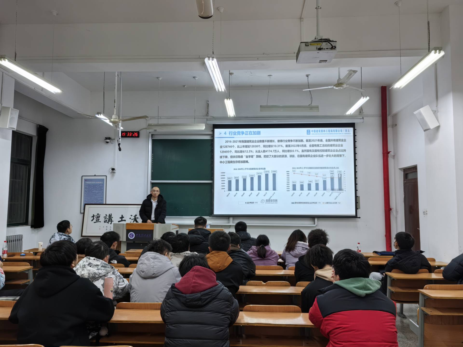 本次讲座由学院2001级土木工程专业校友,中建四局西安分公司副总经理、总工程师曹铖主讲,学院土木工程、工程管理等专业100余名学生及部分辅导员参加讲座。
