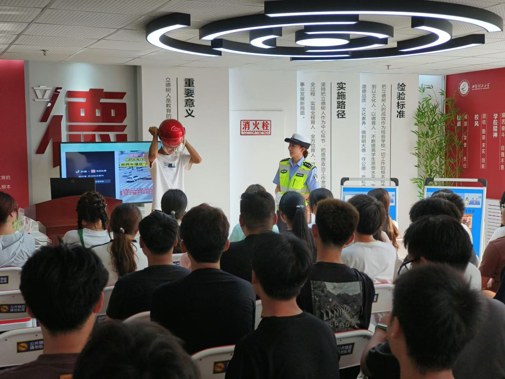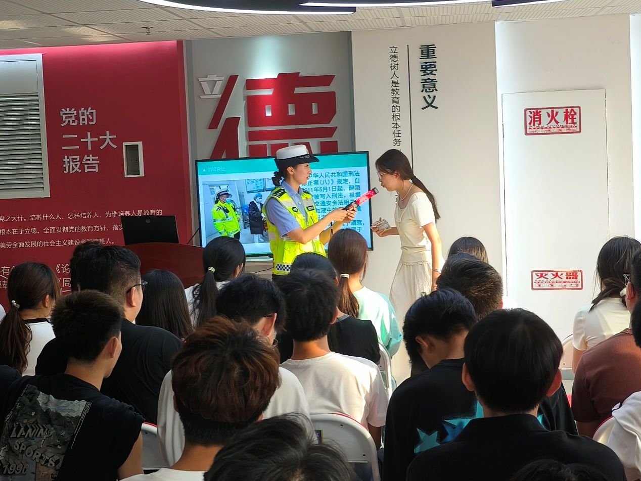 姜警官为在场师生详细讲解了道路交通安全法的相关要求,对骑电动车、摩托车正确佩戴头盔,乘坐汽车时前后排系好安全带,酒后不得驾车等常见道路交通安全问题进行了细致讲解。在互动环节,姜警官与现场师生共同进行了头盔碰撞模拟、食用含酒精食品后酒精检测实验等,现场气氛热烈。