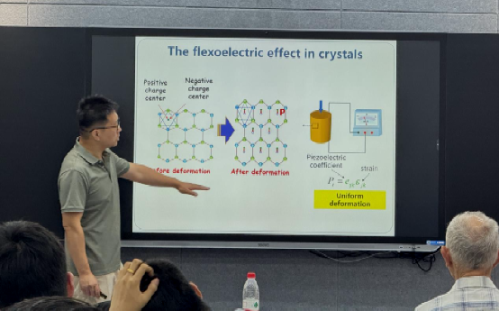 华中科技大学邓谦教授做题为《A personal perspective on flexoelectricity》的报告。邓教授介绍了挠曲电效应的背景起源、研究方法和应用前景,以及他的团队长期以来在理论建模、数值方法和实验研究等方面开展的探索工作,并提出了个人对于挠曲电效应未来发展方向的看法:挠曲电效应将会应用于光-热-电-磁-半导体等领域,引领和深刻影响智能材料和器件的发展。