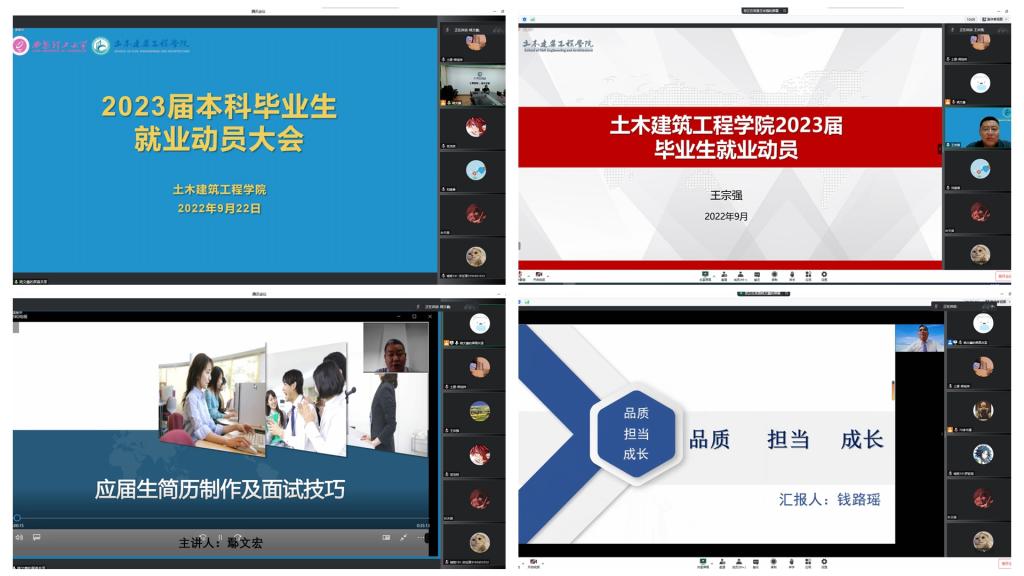 为全面推进2023届毕业生就业工作,学院于9月22日晚7:00召开2023届毕业生就业动员大会。学院党委副书记、副院长赵钦,党委副书记、副院长王宗强,碧桂园广东腾越陕西公司人力行政副总监鄢文宏,中建八局西北公司人力资源部经理冯权,兰州中川国际机场T3航站楼项目部执行经理钱路遥,2023届毕业班辅导员及全体毕业生参加了本次会议。动员会由学工办主任刘蓬晨主持。