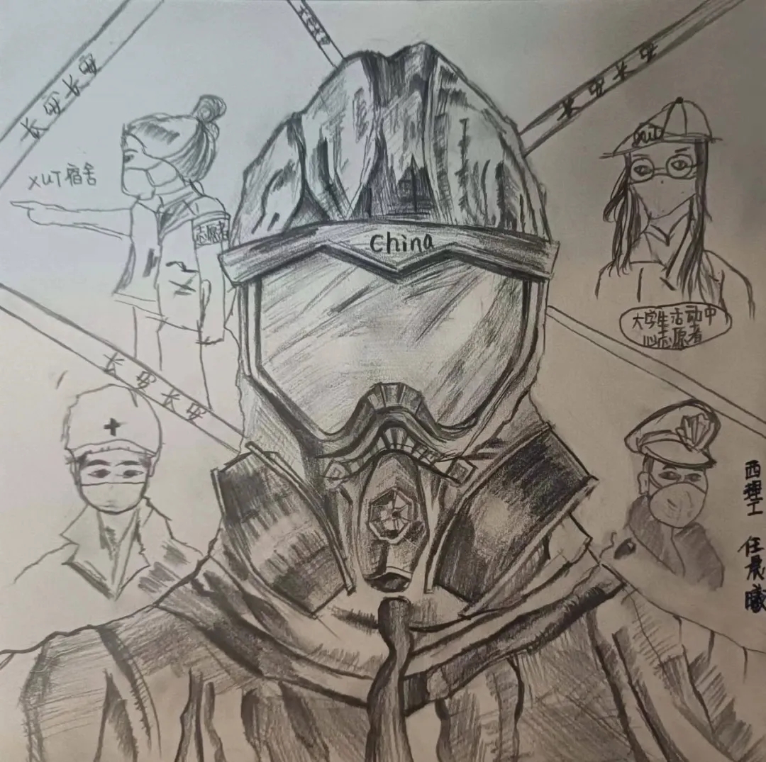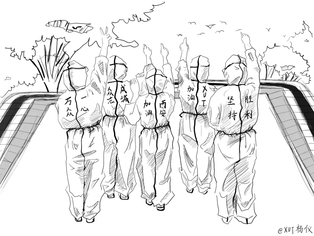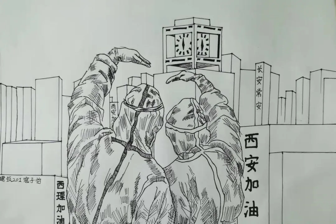 这幅画描述了疫情下的人们,有医生,有警察,还有志愿者们,大家都在努力抗疫,他们坚定的眼神让人们感觉无比心安。再加上西理工的元素,在疫情中西理工的每个人都在努力抗疫。右上角的白鸽象征着希望,我们一定会抗疫成功!西理工加油!西安加油!!!