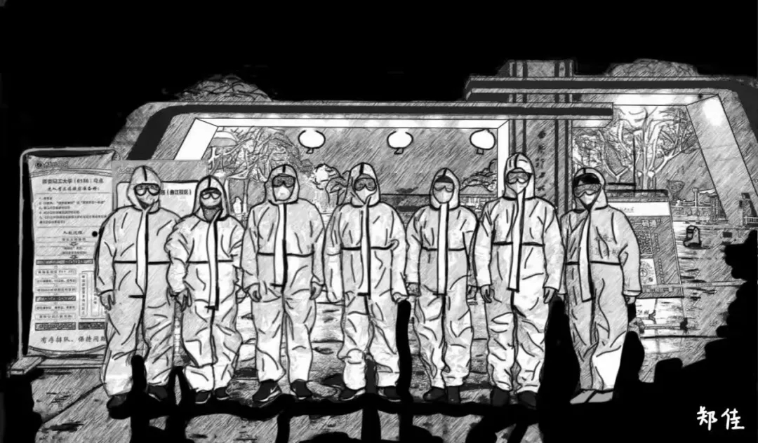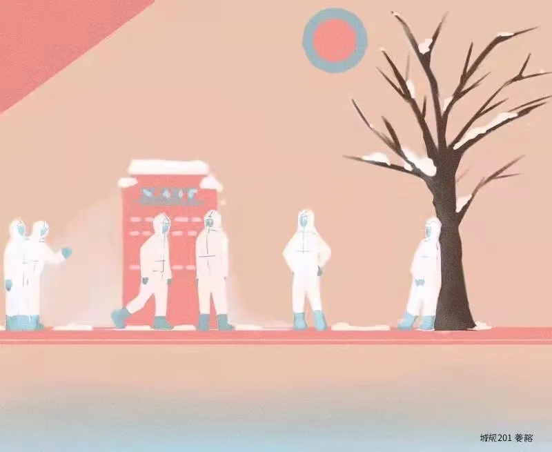 这幅漫画描绘了五位志愿者在永利集团校门前的背影。五位背影坚定又勇敢,他们是善良的逆行者,亦是最美的追光者。他们代表了永利集团万众一心、众志成城的抗疫精神,也表达了我们对防疫胜利的信心和希望。愿凛冬消散后,春暖花开,长安常安!