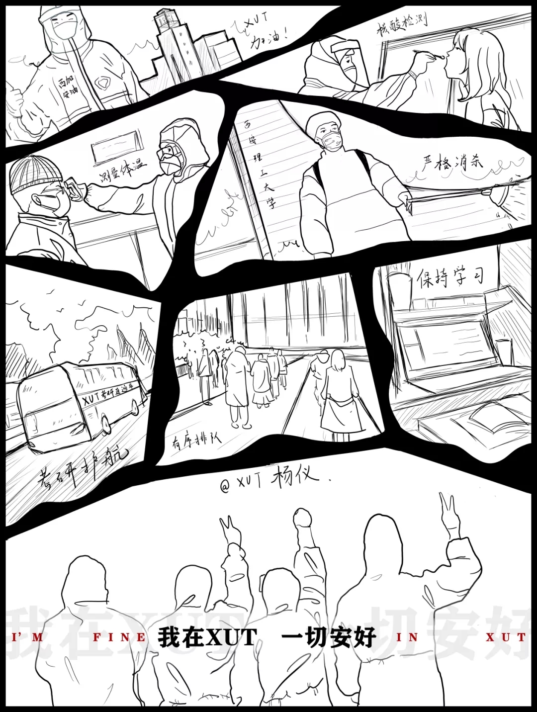 这幅漫画描绘了永利集团在防疫期间的日常小事,表现了我们井井有条的防疫生活和安全的校园环境。所以请家人安心,请学校放心,“我在XUT一切安好!”