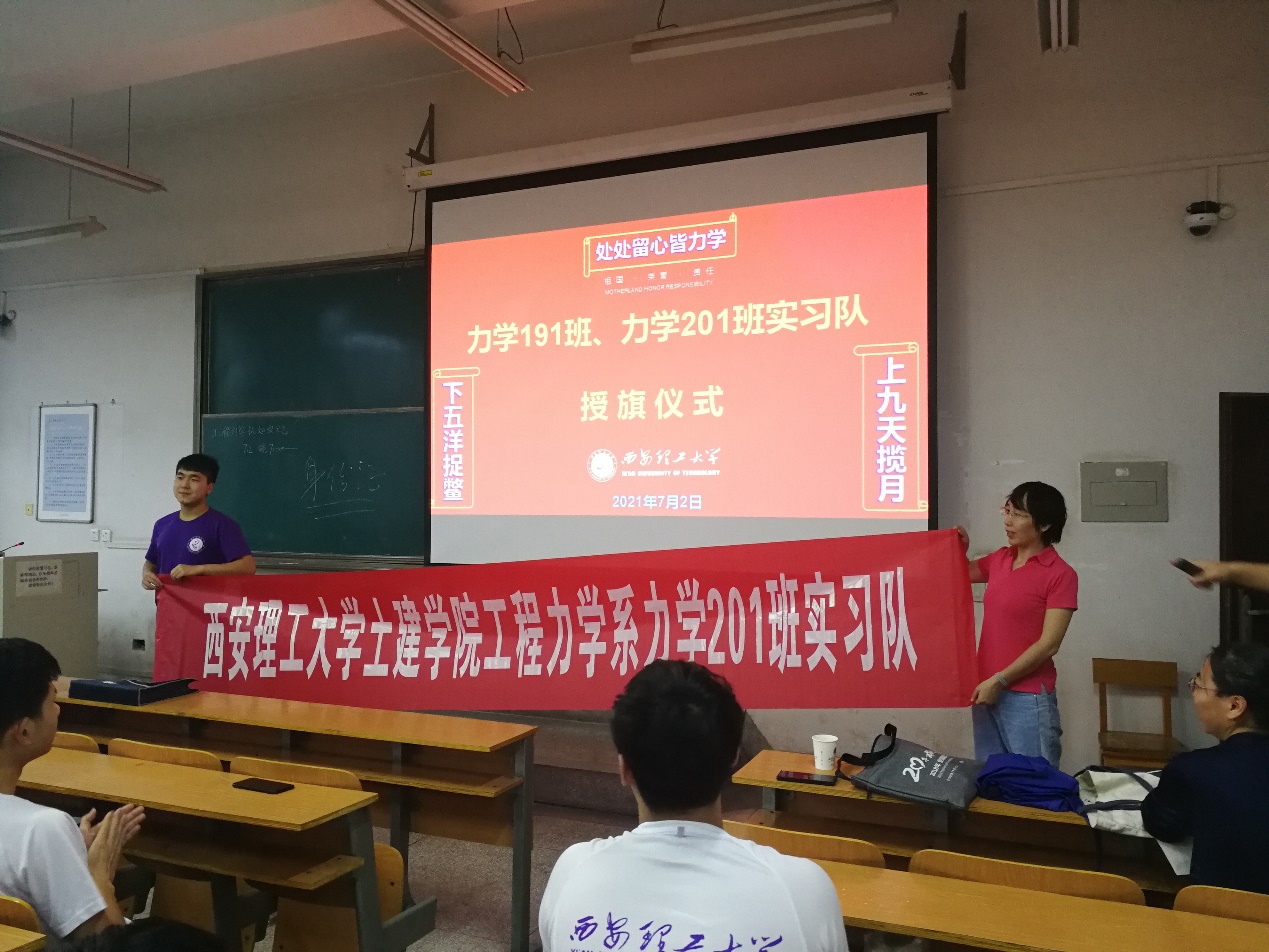 图5.教学副主任解敏为力学201班实习队授旗