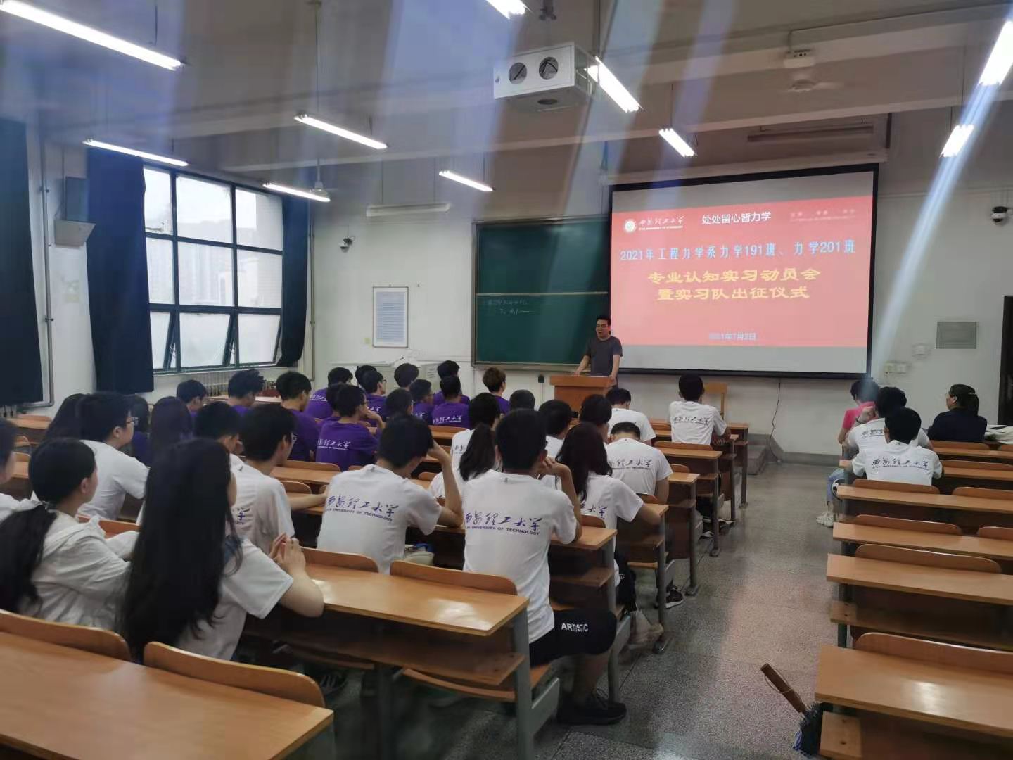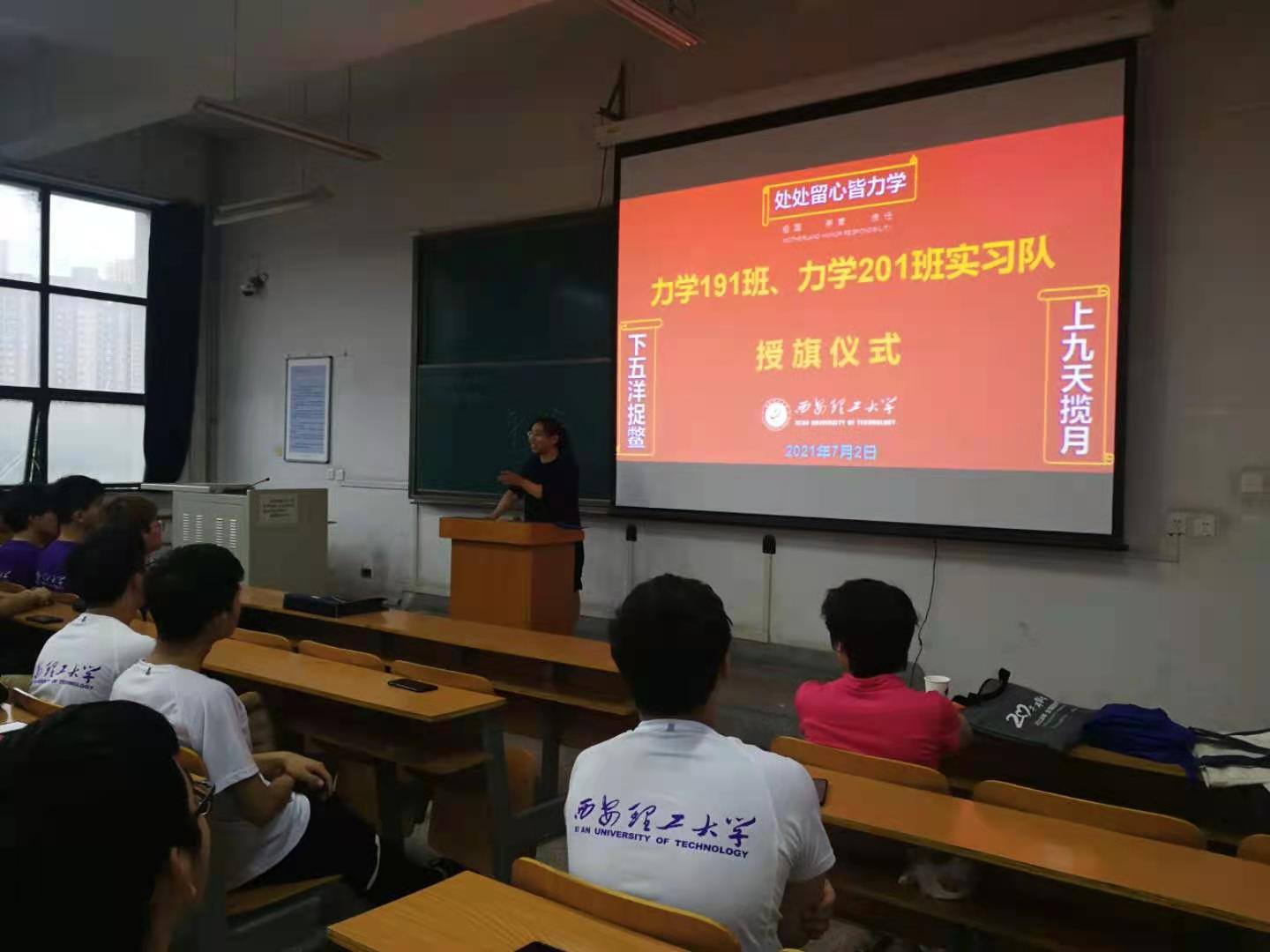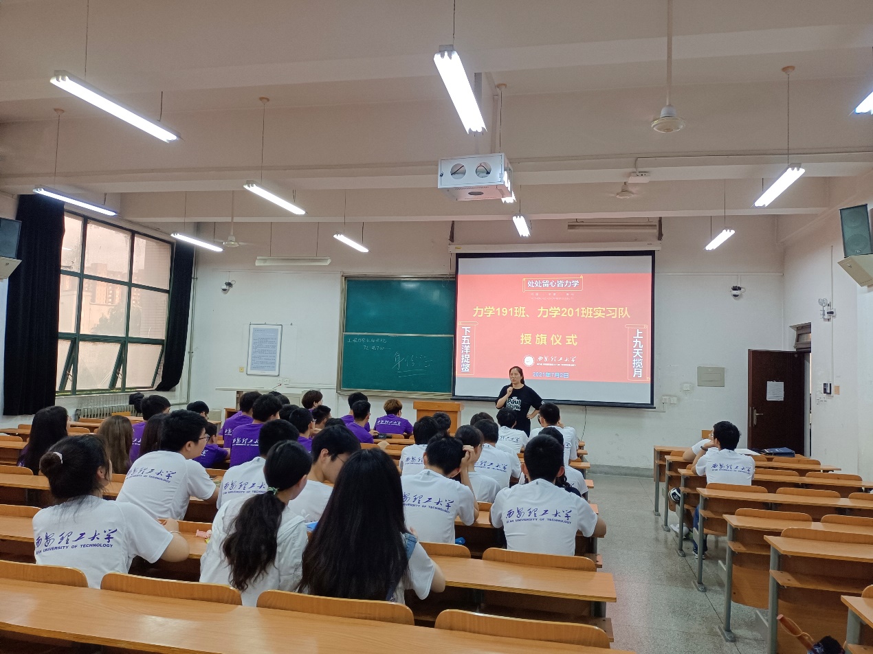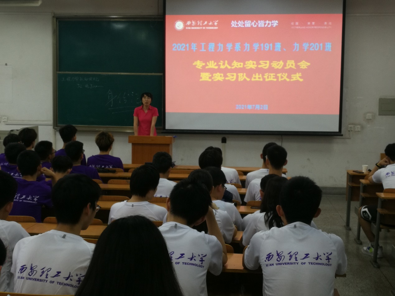 为让学生了解专业认知实习的目的,提高学生对此次实习的重视程度,2021年7月2日晚7点至9点在永利集团曲江校区教十楼举行了“2021年工程力学系力学191班、力学201班专业认知实习动员会暨实习队出征仪式”。工程力学系主任、支部书记王砚和教学副主任解敏分别作了实习动员讲话,激励学生通过本次实习增强对力学专业的兴趣和信心。实习队带队教师刘志强、王垠和孙洋等对实习过程中的安全、纪律和保密等事项作了强调和说明。最后,在力学“可上九天揽月,可下五洋捉鳖”暨“处处留心皆力学”的认知的感召下,举行了简短的实习队授旗仪式。