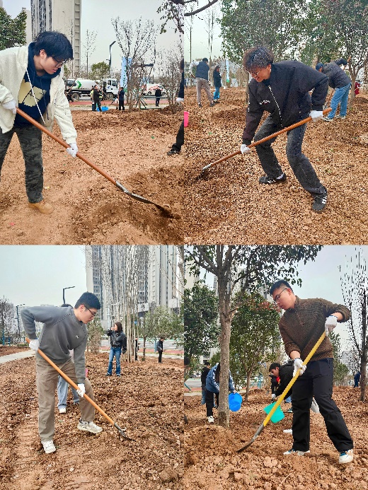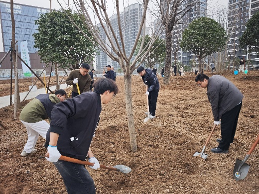 三月的晨风还带着些许料峭,却已裹挟着泥土苏醒的气息。我们踏着晨露来到这片待绿的土地,铁锹与碎石相碰的清脆声响,惊醒了沉睡的春天。每一锹土都承载着绿色的期许,每一滴汗都折射着太阳的光芒。作为土建青年,我们深知,此刻种下的不仅是树苗,更是未来的绿荫与希望。当春风拂过新栽的树梢,我仿佛听见了时光的絮语——那是二十年后,当这片土地绿树成荫时,岁月对我们的赞许。待到盛夏,这里将是一片葱茏;待到经年,这里便是城市的绿肺。而我们,何其有幸,在这片土地上留下了属于春天的印记,也留下了共产党员的责任与担当。
