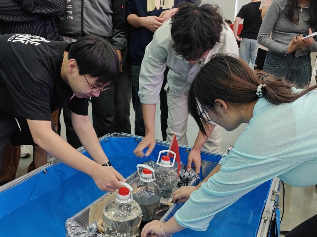 开幕仪式结束后,各参赛队伍依次进行了模型答辩和加载。本次竞赛的赛题为“乌篷船模型结构设计与制作”,竞赛现场,氛围激烈。在模型答辩环节,各参赛队伍现场向评委展示模型和介绍思路并回答评委提问。加载环节,参赛队员的心情随之紧绷,当模型一次一次地承受了加载重量并完成绕障航行,观众的掌声和欢呼声此起彼伏。评委组综合全场表现,指出参赛作品的优点与不足,并对每队的同学进行了悉心指导。经过紧张激烈的角逐,竞赛共评出一等奖2项、二等奖8项、三等奖10项。