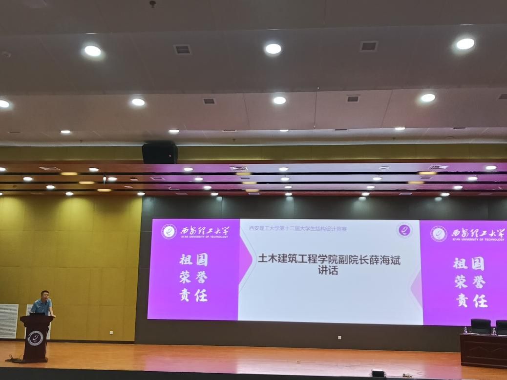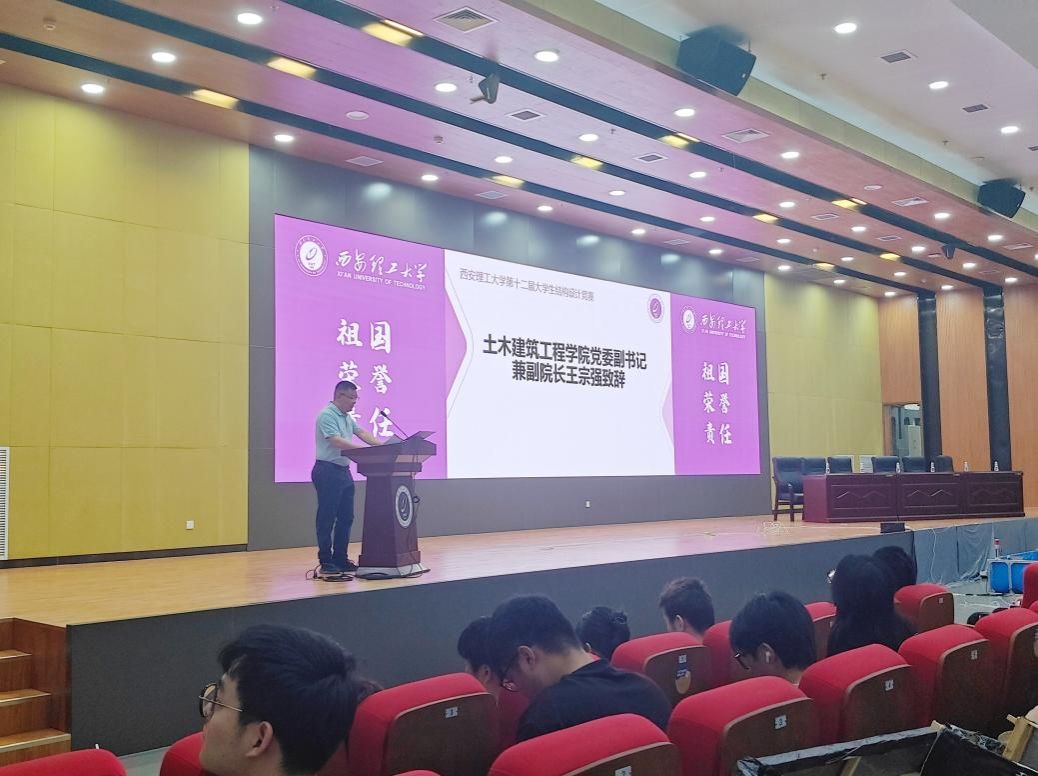 王宗强代表学院向莅临指导的各位领导、专家评委,以及竞赛筹备工作人员表示衷心的感谢,向积极备赛的全体参赛队伍致以诚挚的问候,希望各位参赛同学能够广开思路,赛出水平,赛出风格。薛海斌指出近年来我校结构设计竞赛团队经过省赛的层层选拔、国赛的实战淬炼,成绩斐然,在陕西省同类院校中稳居第一梯队,希望同学们再接再厉,在协作中绽放友谊之光,于竞技中彰显专业锋芒。