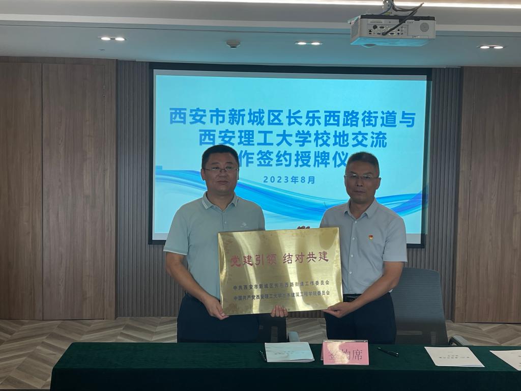 8月31日下午,学院赴西安市新城区长乐西路街道办进行校地交流走访活动,并举行党(工)委联建和大学生社会实践基地签约授牌仪式。学院党委副书记兼副院长王宗强,教师师佳炜、王端藓、孙东宇,长乐西路街道党工委副书记赵云龙,党群服务中心主任李欣笑,党建办负责人黄维攀,城市更新服务中心负责人魏仙妮,综治网格服务中心负责人常敏佳等共同出席会议及签约授牌仪式。